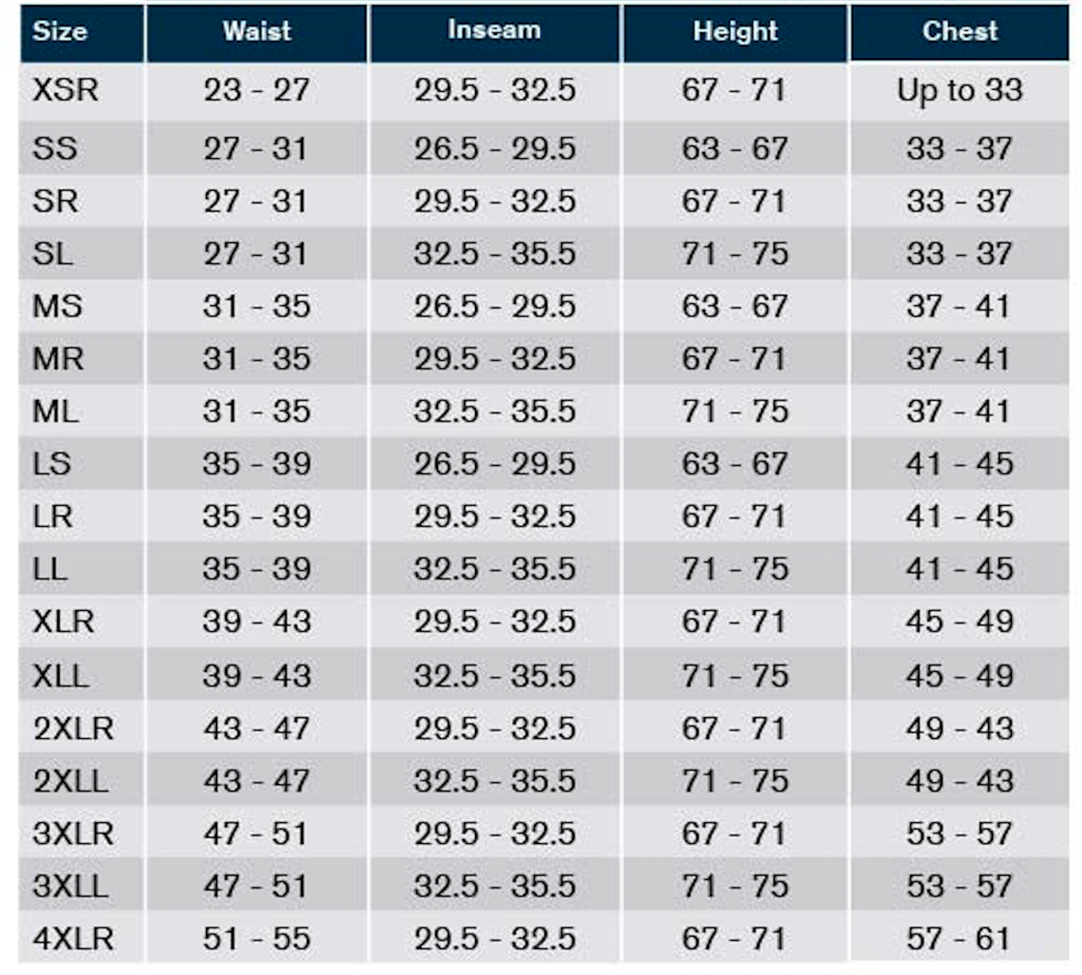• Short: 26.5" - 29.5" | Regular: 29.5" - 32.5" | Long: 32.5" - 35.5"